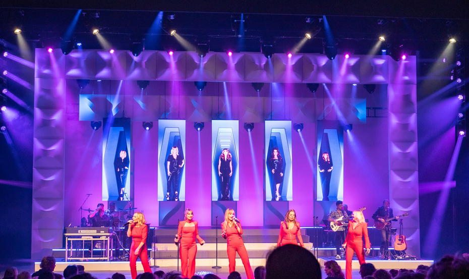 Aesthetically, the design challenge for this show was hitting the perfect balance between lighting, video and set, and ensuring that the five Dolly Dots remained firmly the centre of attention. The slick, classy looking set comprises an upstage pros arch made from scenic décor panels which frames the five 1-metre-wide by 3-metre-high video columns. This frame also contains a cross-stage header-style banner upstage of the LED screens, made from gauze, which moves up and down – utilising the house fly bars – to help change the appearance of the space.